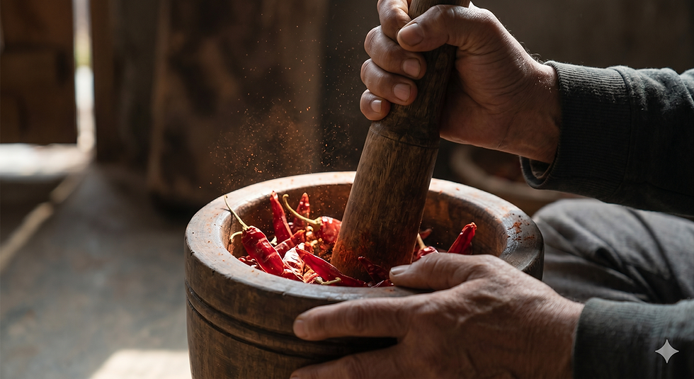 Single Origin from the heritage fields of Pampore in the valleys of Kashmir. Procured directly from a close-knit community of traditional farmers who have cultivated this crop for generations, carefully preserving their indigenous heirloom seeds. Naturally sun-dried, then meticulously crushed using traditional neem wood-pounding, incorporating less than 2% organic cold-pressed mustard oil. This careful process ensures the spice is never exposed to flavor-destroying heat, perfectly retaining its rich essential oils, signature complex flavor, and vibrant natural crimson hue.